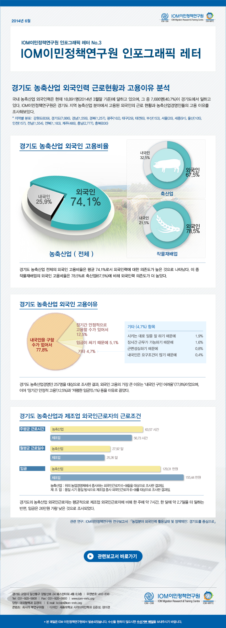 이번 인포그래픽은 2013년에 출간된「농업분야 외국인력 활용실태 및 정책제어: 경기도를 중심으로」연구보고서 내에서 다룬 ‘경기도 농축산업 외국인력 근로현황과 고용이유 분석’에 대한 조사 결과를 토대로 구성하였습니다.