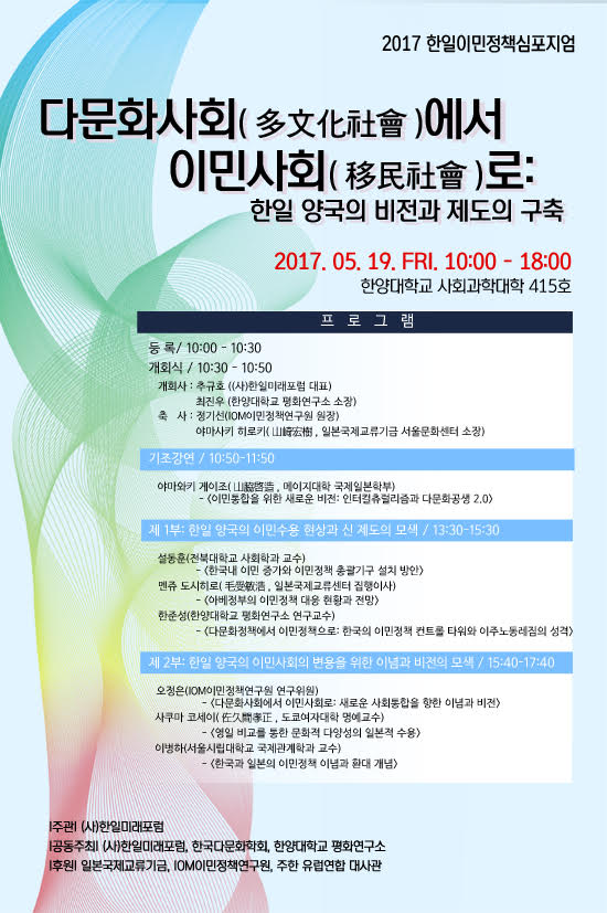 한일 양국은 심각한 소자화고령화 현상, 총인구와 생산활동인구 감소로 이민담론에 대한 논의가 활성화되고 있으며, 이민수용의 제도변화를 검토하고 있습니다. 한국내 이민은 이미 205만명으로 총인구의 4.1%를 차지하고 있으며, 일본은 238만명으로 1.8%에 달하였습니다. 외국인이 빠른 속도로 증가하는 한국과 일본에 있어서 이민정책의 변화와 제도변경의 모색은 공통된 현상으로, 상호간 풍부한 함의와 시사점을 던져주고 있습니다. 이번에 (사)한일미래포럼, (사)한국다문화학회, 한양대학교 평화연구소가 공동주최하는 “다문화사회에서 이민사회로: 한일 양국의 비전과 제도의 구축”은 노동이민, 결혼이민, 유학생 등, 이민이 증가하고, 이민국가로의 변용이 불가피한 한국과 일본에서 어떻게 새로운 이념과 시스템을 구축할 것인가, 보다 적극적으로 미래의 이민사회를 준비하고, 새로운 이념과 제도모색을 통하여 변화의 리더십을 확보하고자 함이 목적입니다. 한국의 2015년 저출산고령화 위원회 보고서는 이민청 설치에 대한 검토를 제안하였으며, 정부수준에서 구체적인 대안을 논의하고 있습니다. 일본은 2014년 정부직속 [선택하는 미래위원회] 보고서에서 인구1억명 유지를 위해 매년 20만명의 이민수용을 검토한 바 있습니다. 이민사회, 이민국가로의 변화와 변용은 문화적 다양성, 사회적 활력의 재생, 성장형 경제의 정착에 불가결한 전제가 되고 있습니다. 이민수용을 둘러싼 국내 찬반 논쟁은 이민사회로의 변화에 반드시 거쳐야 할 과정입니다. 이민국가로의 전환이 불가피하다면, 새로운 문화적 다양성과 사회통합의 이념과 비전을 어떻게 형성해 갈 것인가. 유럽의 인터컬츄럴리즘, 일본의 다문화공생, 한국의 다문화를 상호비교하면서 새로운 이론적 토대를 탐색하고자 합니다. 한일 양국의 이민사회로의 변용에 요구되는 이념과 제도의 대안 찾기가 본 심포지움의 목적입니다. 여러 가지 바쁘실줄 아오나, 부디 오셔서 자리를 빛내주시기 바랍니다. 감사합니다. |