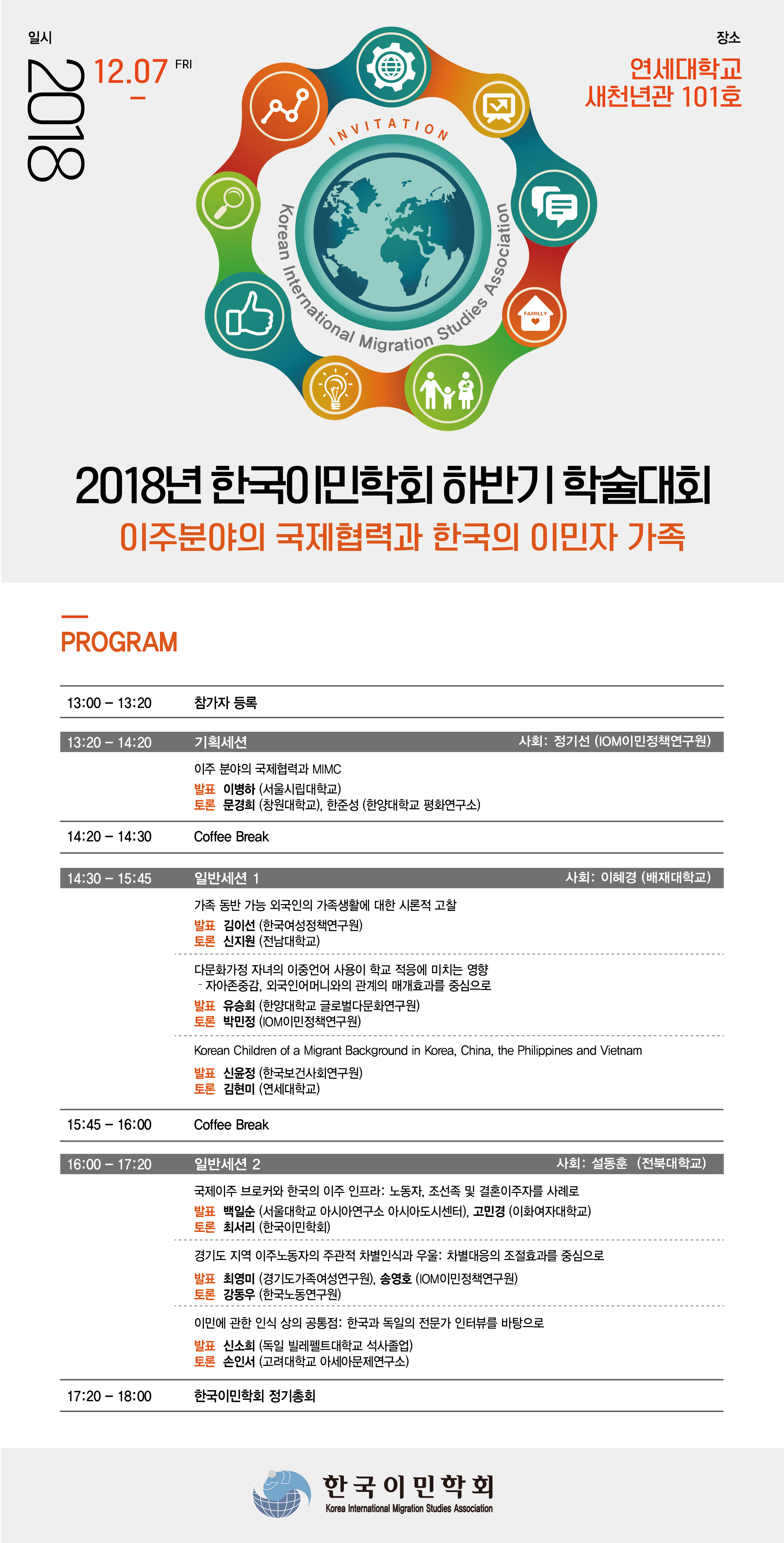 ▣ 행사명 : 2018년 한국이민학회 하반기 학술대회 "이주분야의 국제협력과 한국의 이민자 가족"