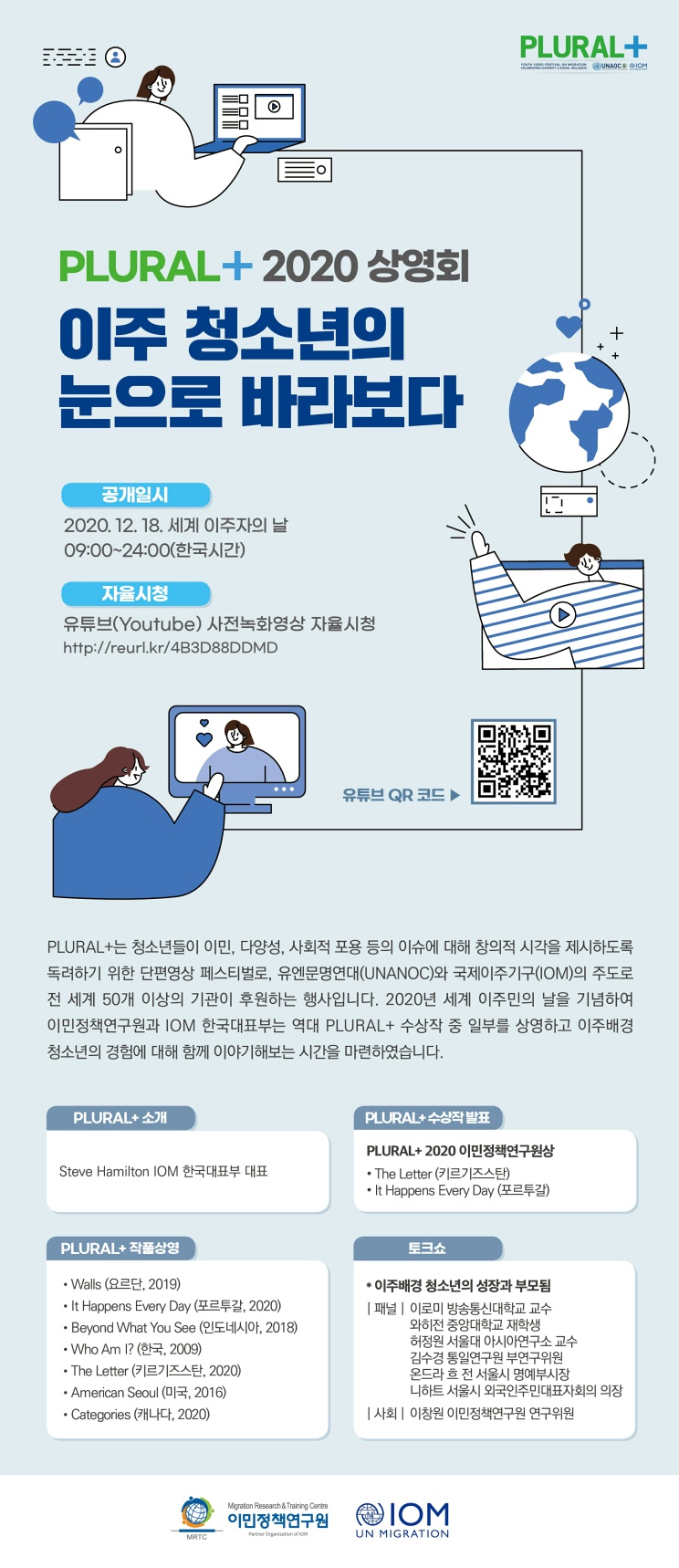 이민정책연구원이 세계 이주자의 날을 기념하여 “2020 국제청소년 UCC페스티벌 PLURAL+” 상영회를 개최합니다.