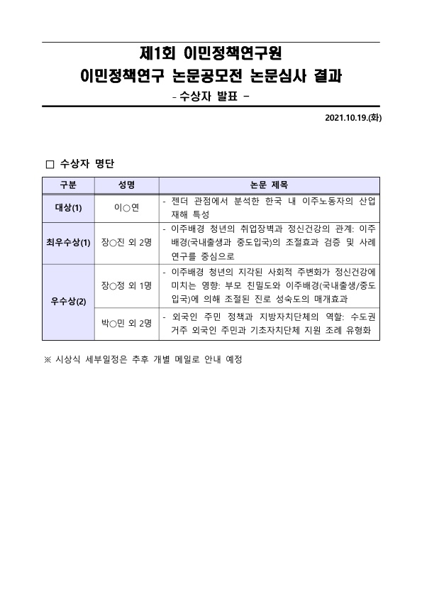 제1회 이민정책연구원 대학(원)생 대상 이민정책연구 논문공모전 수상자를 아래와 같이알립니다.