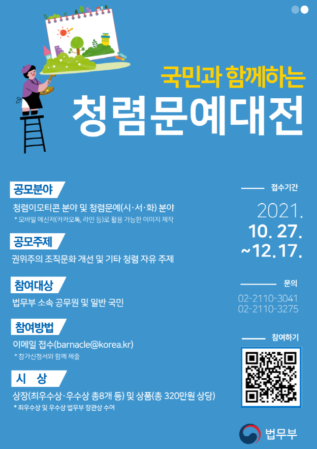 ‘국민과 함께하는 더 청렴한 법무부’를 만들기 위해 청렴문예대전 공모전을 실시합니다.