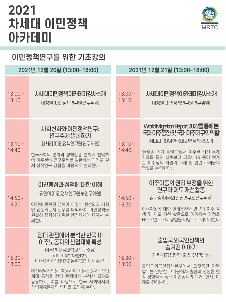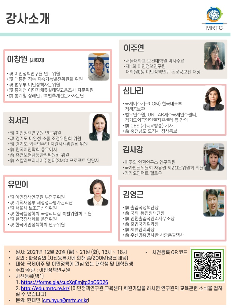 2021년에는 이민정책연구를 위한 기초강의라는 주제로 동 연구원에 소속되어 있는 연구위원들과 국제이주 관련 여러 기관에서 경력을 쌓아오신 전문가들께서 강의를 진행하실 예정입니다.
