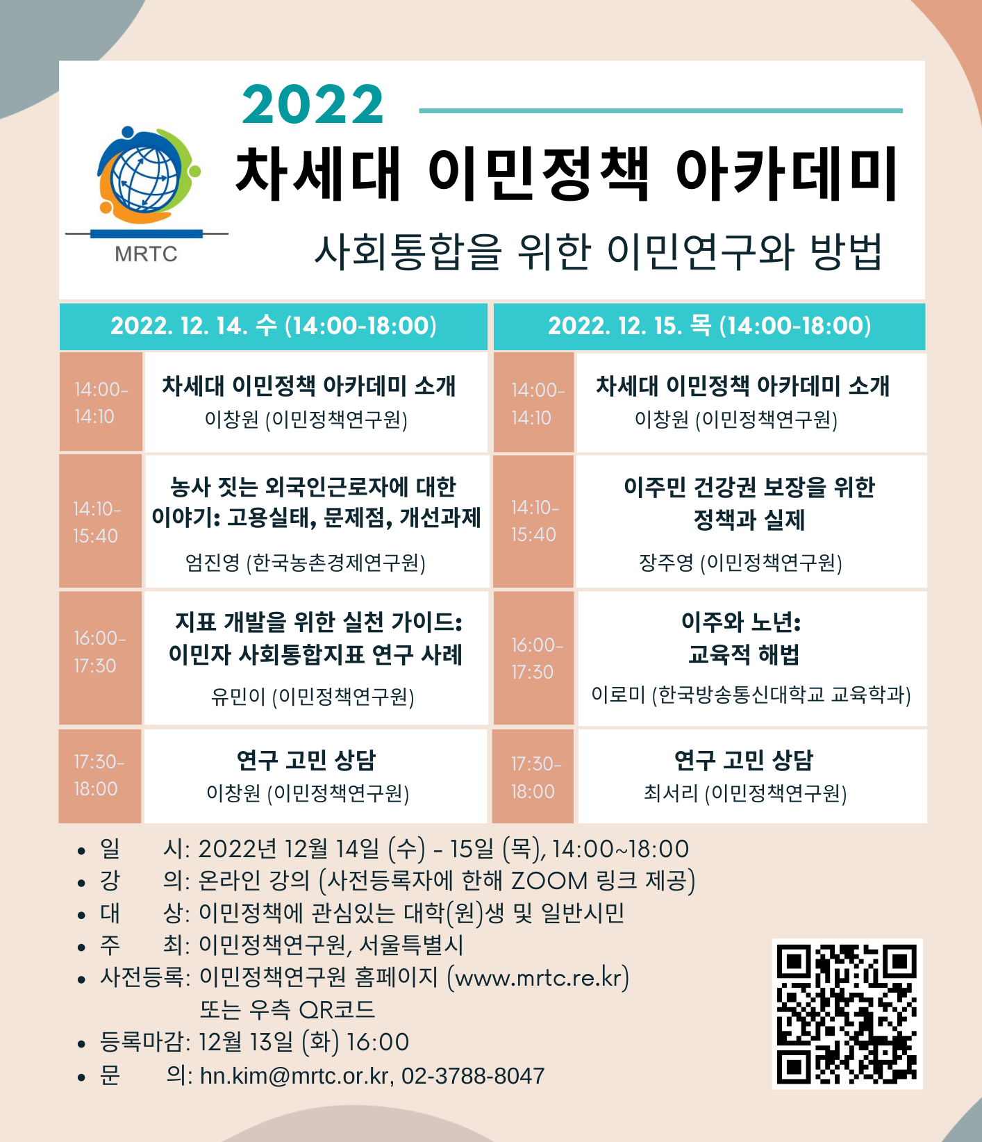 이민정책연구원이 서울시와 공동주최로 “2022 차세대 이민정책 아카데미”를 개최합니다. 올해 차세대 이민정책 아카데미는 “사회통합을 위한 이민연구와 방법”이라는 주제로 12월 14일과 15일 양일간, 오후 2시부터 6시까지 걸쳐 온라인으로 진행됩니다. 농업이주노동자, 한국형 이민자 사회통합지표, 이주민의 건강권, 이주민과 노년 등 다채로운 주제의 강연이 준비되어 있습니다. 또한 학문후속세대와 함께 정책 현장의 다양한 경험과 연구 경험을 공유하고 연구 주제를 함께 모색하는 시간도 마련하였습니다. 대학(원)생을 비롯하여 국제이주 및 이민정책 연구에 관심 있는 분들의 많은 관심과 참여 부탁드립니다.