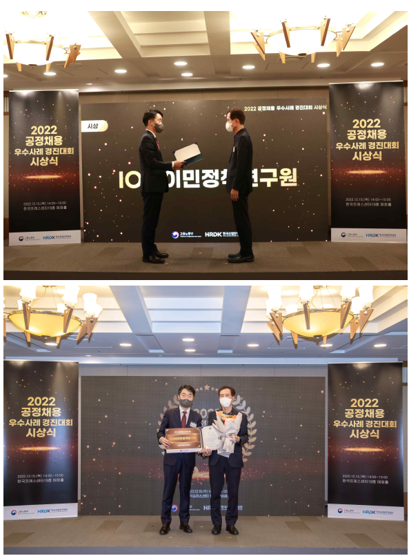 ○ 2022년 12월 15일, 서울 중구 프레스센터에서 개최된 '2022 공정채용 우수사례 경진대회 시상식'에는 손홍기 부원장이 참석하여 상장을 수여하였습니다.
