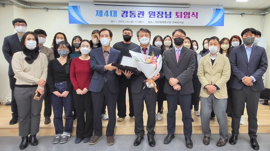 2020년 1월 9일부터 2023년 1월 8일까지 연구원의 위상 제고와 발전을 위해 애써주신 강동관 원장님의 퇴임식이 2023년 1월 6일에 연구원 2층 국제회의실에서 개최되었습니다.