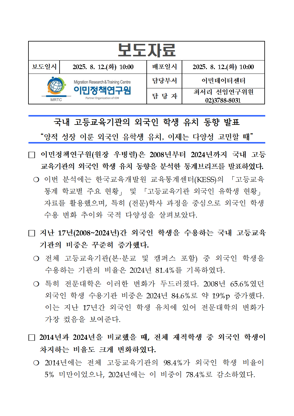 이민정책연구원은 데이터 기반의 연구 성과를 전문 교육 콘텐츠로 제작하여 확산합니다. 국내외 네트워크와의 전략적 파트너십을 통해 정책 실행력을 강화하고 있습니다.