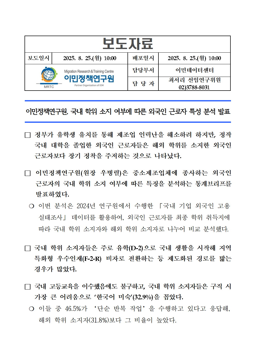 이민정책연구원은 데이터 기반의 연구 성과를 전문 교육 콘텐츠로 제작하여 확산합니다. 국내외 네트워크와의 전략적 파트너십을 통해 정책 실행력을 강화하고 있습니다.