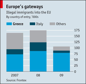 그리스가 유럽국가를 불법적으로 입국하려는 외국인들의 경유지로 악용되고 있어 그리스 정부는 어려운 상황에 처해있다. 2009년 EU 내로 불법입국을 시도한 전체 106,200명 중 4분의 3이 그리스를 경유지로 이용하였다. 심각성은 EU내에서 불법입국으로 적발된 자는 최초 도착 EU국가 - 주로 그리스-로 보내지게 된다는 사실에 있다.