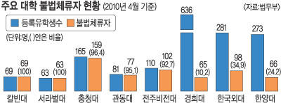 외국인 유학생을 대상으로 운영되는 대학들의 한국어학원이 불법체류자 양성기관으로 변질된 것으로 드러났다. 한국외대, 한양대 등 수도권 주요 대학의 한국어연수생도 20∼30%가 불법체류자였다.