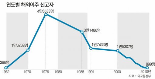 해외이주 신고자 통계를 처음 작성한 1962년 386명이던 해외이민은 1963년 2901명으로 급격히 늘었다. 1969년 이민자는 9755명으로 증가했고 1970년(1만6268명) 처음으로 이민자 1만 명 시대를 맞았다. 1976년의 이민자는 4만6533명으로 정점에 달했다.