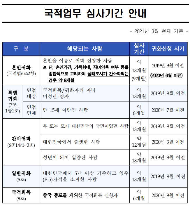 ▣ 제목 : 2021년 3월 기준 국적업무 심사기간 안내