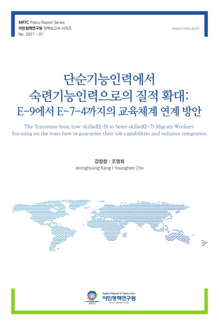이 연구는 한국사회의 필요인력 확보차원에서 2017년부터 시행되어 온 단순기능인력(E-9)에서 숙련기능인력(E-7-4)으로 체류자격을 전환하는 점수제 숙련기능인력제도의 질적 확대를 위한 제도 개선 방안 모색에 목적을 두고 있다. 숙련기능인력의 수적 확대에 따른 부작용을 최소화하기 위한 질적 확대 수단으로 ‘업무숙련도’와 ‘사회통합수준’ 제고 측면의 외국인근로자의 교육・훈련의 중요성에 주목하여, E-9에서 E-7-4로의 교육체계를 분석하였고, 이 제도의 당사자(E-7-4)들을 대상으로 한 심층인터뷰와 관련전문가의 자문을 통해 의견을 수렴하여 숙련기능인력(E-7-4)이 되기까지의 참여교육 실태 파악 및 동 제도 시행에 따른 애로점과 그에 따른 개선 방안을 제시하였다.