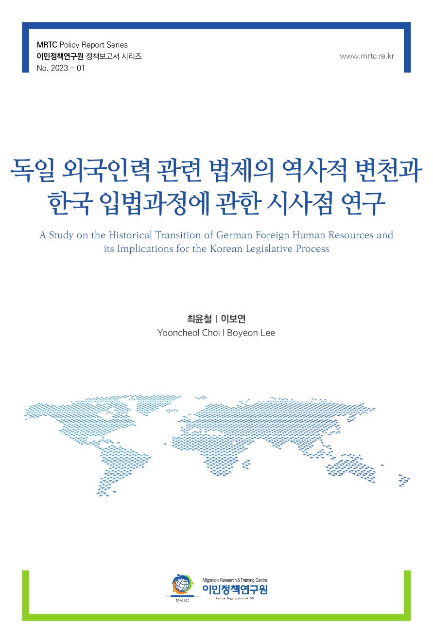 저출산·고령화로 인한 인구구조 변화는 노동시장의 구조적 변화를 초래하여 한국 사회의 지속가능성에 심각한 장애가 될 것으로 예상된다. 외국인 노동력 공급정책이 지속되어 왔으나 노동력 부족을 해결하지 못하고 있으며, 특히 전문인력과 숙련노동인력이 부족한 상황이다. 독일은 외국인 노동력을 자국 노동시장에 공급해온 대표적 국가로서, 비교대상으로 의미가 있다. 특히 최근에는 인구구조 변화와 노동시장의 구조적 변화에 대응하고 경제발전을 지속하기 위해 전문인력 및 숙련노동인력 도입을 위한 법제와 정책을 마련하는데 주력하고 있어 한국이 참조할 만한 사례가 될 수 있다. 이 보고서는 비교법적 연구를 통해 외국인 노동력의 질적 개선을 위해 전문인력의 개념 정의, 외국인노동자의 전문자격·숙련 정도에 따른 차별적 정책 수립, 외국인력 도입 대상을 저숙련노동자에서 전문노동인력으로 전환, 국내 유학생 활용방안 확대, 외국학위자 유치를 위한 방안을 마련 등 대안을 제시했다. 이를 위하여 외국인노동자 정주화를 대비한 법제와 정책, 사회통합과 공존을 위한 법제를 마련해야 할 것이다.