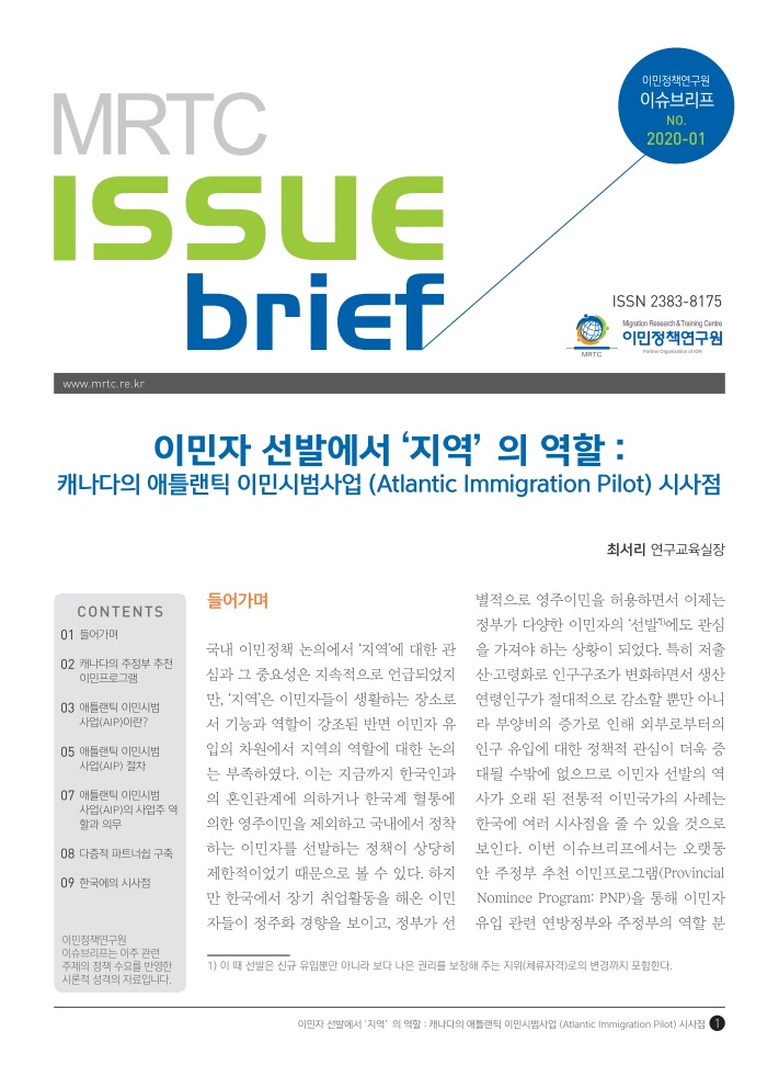 국내 이민정책 논의에서 ‘지역’에 대한 관심과 그 중요성은 지속적으로 언급되었지만, 이민자 유입의 차원에서 지역의 역할에 대한 논의는 부족하였다. 한국에서 장기 취업활동을 해온 이민자들이 정주화 경향을 보이고, 정부가 선별적으로 영주이민을 허용하면서 이제는 정부가 다양한 이민자의 ‘선발’에도 관심을 가져야 하는 상황이 되었다. 이 이슈브리프는 오랫동안 주정부 추천 이민프로그램(Provincial Nominee Program: PNP)을 통해 이민자 유입 관련 연방정부와 주정부의 역할 분담을 고민해 온 캐나다의 사례, 특히 2017년부터 시범사업으로 운영되고 있는 애틀랜틱 이민시범사업(Atlantic Immigration Pilot: AIP)을 살펴보면서 국내 이민자 유입에 있어서 ‘지역’의 역할에 대한 고민을 해보도록 한다. 애틀랜틱 캐나다 지역의 4개 주는 저조한 이민자 유지율을 제고하기 위해 경제성장과 일자리, 협업을 강조하는 AIP를 시행하고 있다. 이 사례는 이민자의 유입과 정착이 함께 논의되어야 하고, 이민자의 정착은 지역의 다양한 자원이 동원되어야 하기 때문에 지역 공동체의 관심이 무엇보다 중요함을 보여 준다. 더불어 취업을 목적으로 유입된 이민자가 대부분을 시간을 보내는 장소가 직장이고, 한국어, 한국문화 강의 수강 등 이민자의 정착에 필요한 활동은 직장의 협조 없이 이루어질 수 없기 때문에 이민자 지역 정착에서 사업주의 역할도 강조될 필요가 있다. 한국형 지역추천 이민제도가 도입된다면 중앙정부, 광역자치단체, 사업체, 민간기관간 파트너쉽이 중요할 것으로 보인다.