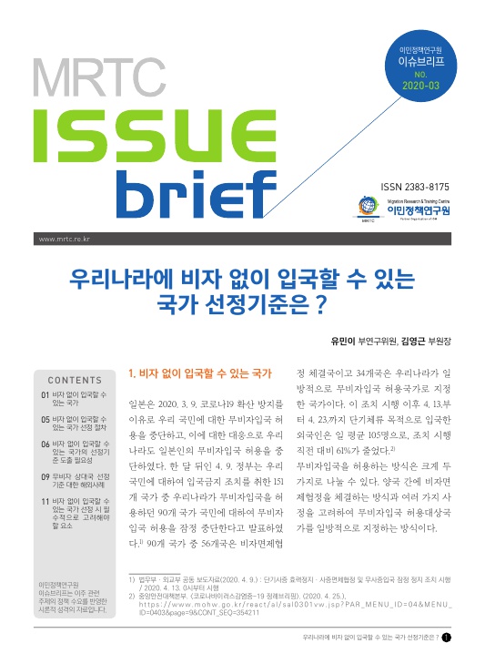 이 브리프는 우리나라에 관광ㆍ통과 등의 목적으로 단기체류할 때 비자없이 입국이 가능한 ‘무비자제도’를 유형별로 설명하고, 비자면제협정 상대국 및 무비자 ‘지정’국가의 선정 시 고려해야 할 원칙과 조건을 탐색하였다. 또한 이미 체결 및 지정된 무비자국의 입국관리상의 문제점을 보완하기 위하여 ‘기존 입국 외국인 및 여행자정보 공유를 통한 데이터의 전산화ㆍ빅데이터화’, ‘eTA의 도입’, ‘AI를 활용한 외국인 정보 빅데이터와 eTA 신청자 정보의 비교ㆍ대조’를 통한 4단계의 입국절차 강화 등을 제시하였다.