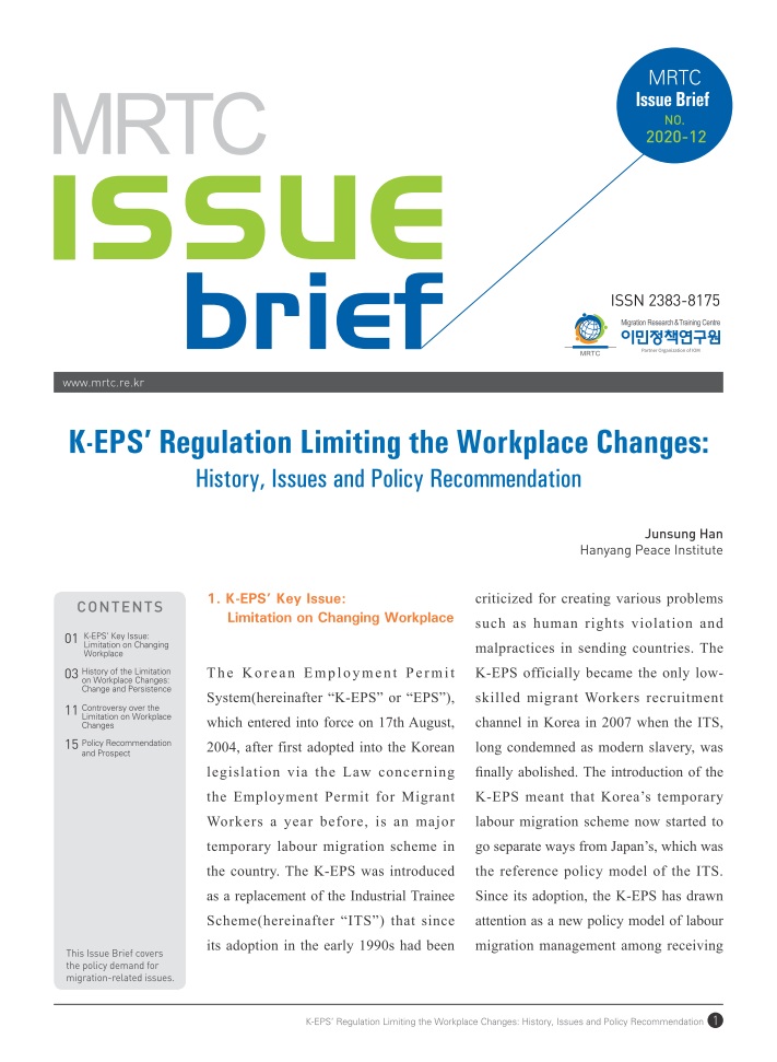 사업장 변경 제한 규정은 한국 이주노동정책 논의에서 뜨거운 감자다. 그렇지만 적어도 정책 영역 내에서는 두 가지 관점이 균형 있게 반영되지 못한 채 ‘국민경제의 논리’가 압도하고 있는 것으로 보인다. 그럼에도 불구하고 K-EPS는 여전히 많은 예비 외국인근로자들(E-9)에게 ‘매력적인’ 제도로 인식되고 있는 듯하다. 이 글은 이상의 논의를 바탕으로 K-EPS의 첨예한 쟁점인 사업장 이동 제한 규정의 변천사와 쟁점을 한국의 이주노동정책에 관심을 가진 해외 독자들에게 소개하는 것을 목표로 한다.