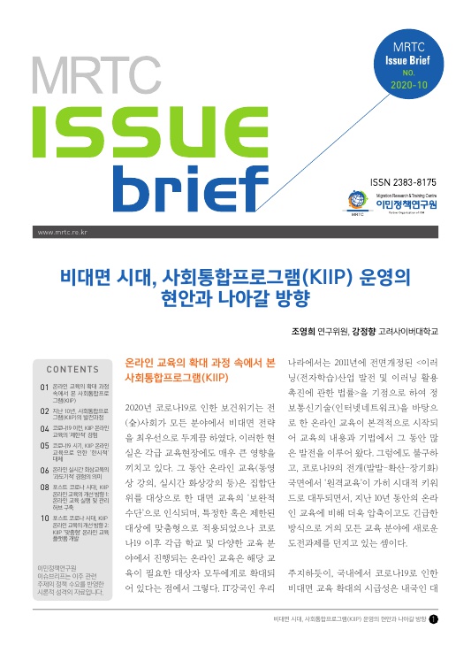 - 코로나19로 인해 대면으로 진행하는 사회통합프로그램(KIIP) 실시가 불가능해짐에 따라, 4월부터 본격적으로 도입된 온라인실시간 화상 교육의 현황과 관련 쟁점을 살펴봄.
