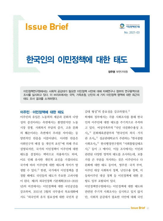 이민정책연구원에서는 사회적 공감대가 필요한 이민정책 사안에 대해 자체 연구나 정부의 연구용역으로 조사를 실시하고 있다. 이 브리프에서는 국적, 가족 초청, 난민의 세 가지 이민정책 영역에 대한 최근의 태도 조사 결과를 소개하였다.