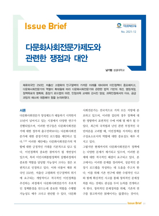 체류외국인 250만, 저출산 고령화의 인구절벽의 가까운 미래를 대비하여 이민정책이 중요해지고, 다문화사회전문가의 역할이 확대됨에 따라 다문화사회전문가와 관련한 법적 기반의 개선, 명칭개정, 정책목표의 명확화, 중장기 로드맵의 마련, 인정과목 교재와 강사진 양성, 과목인정에서의 이슈, 공급과잉의 해소에 대응해야 함을 논의하였다.