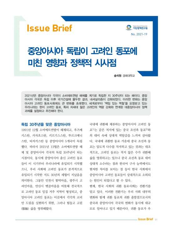 2021년은 중앙아시아 각국이 소비에트연방 해체를 계기로 독립한 지 30주년이 되는 해이다. 중앙아시아 각국은 독립 이후 국가건설에 몰두한 결과, 내셔널리즘이 강화되었다. 이러한 변화는 중앙아시아 고려인 동포사회에도 큰 변화를 초래했다. 세계로부터 ‘책임 있는 역할’을 요청받고 있는 우리나라는 현지 고려인 동포, 특히 차세대 젊은 고려인의 역량 강화와 연계된 대중앙아시아 정책 과제를 설정하고 추진해야 한다.