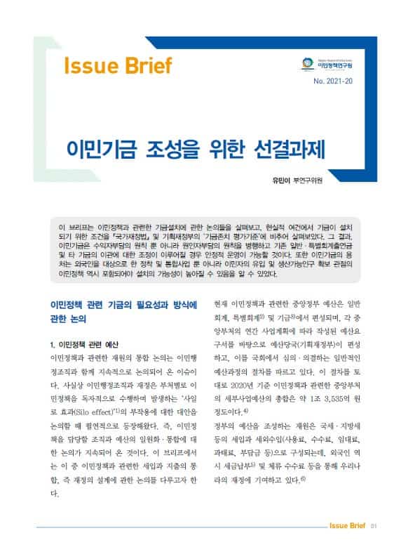 이 브리프는 이민정책과 관련한 기금설치에 관한 논의들을 살펴보고, 현실적 여건에서 기금이 설치되기 위한 조건을 『국가재정법』 및 기획재정부의 ‘기금존치 평가기준’에 비추어 살펴보았다. 그 결과, 이민기금은 수익자부담의 원칙 뿐 아니라 원인자부담의 원칙을 병행하고 기존 일반·특별회계출연금 및 타 기금의 이관에 대한 조정이 이루어질 경우 안정적 운영이 가능할 것이다. 또한 이민기금의 용처는 외국인을 대상으로 한 정착 및 통합사업 뿐 아니라 이민자의 유입 및 생산가능인구 확보 관점의 이민정책 역시 포함되어야 설치의 가능성이 높아질 수 있음을 알 수 있었다.