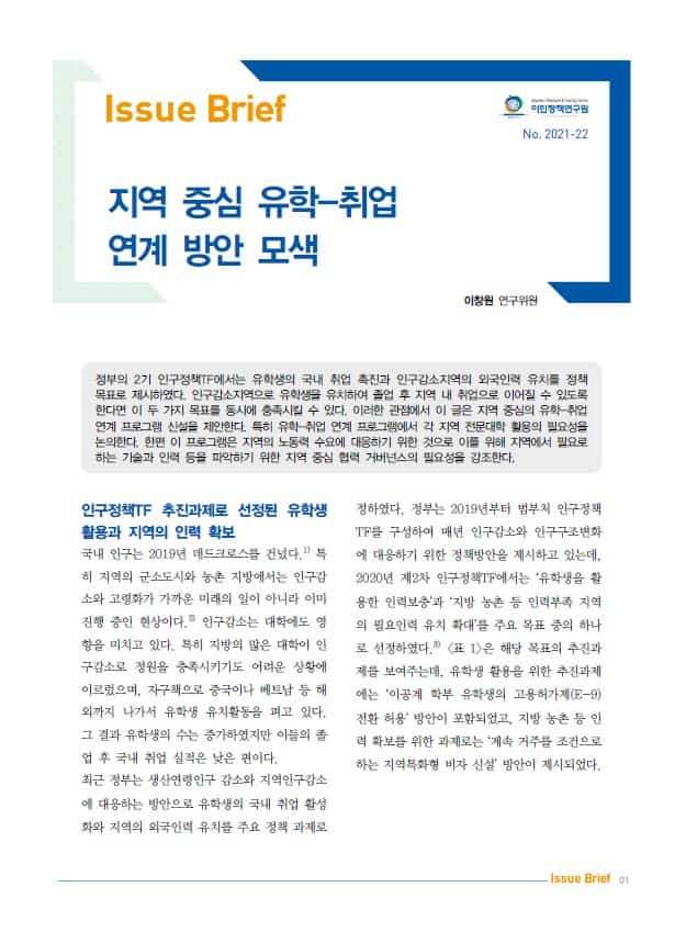 정부의 2기 인구정책TF에서는 유학생의 국내 취업 촉진과 인구감소지역의 외국인력 유치를 정책목표로 제시하였다. 인구감소지역으로 유학생을 유치하여 졸업 후 지역 내 취업으로 이어질 수 있도록 한다면 이 두 가지 목표를 동시에 충족시킬 수 있다. 이러한 관점에서 이 글은 지역 중심의 학업-취업 연계 프로그램 신설을 제안한다. 특히 유학-취업 연계 프로그램에서 각 지역 전문대학 활용의 필요성을 논의한다. 한편 이 프로그램은 지역의 노동력 수요에 대응하기 위한 것으로 이를 위해 지역에서 필요로 하는 기술과 인력 등을 파악하기 위한 지역 중심 협력 거버넌스의 필요성을 강조한다.