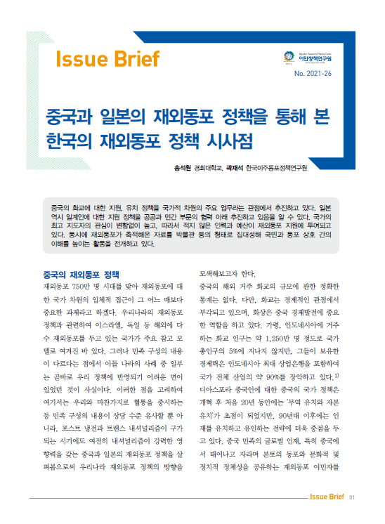 중국의 화교에 대한 지원, 유치 정책을 국가적 차원의 주요 업무라는 관점에서 추진하고 있다. 일본 역시 일계인에 대한 지원 정책을 공공과 민간 부문의 협력 아래 추진하고 있음을 알 수 있다. 국가의 최고 지도자의 관심이 변함없이 높고, 따라서 적지 않은 인력과 예산이 재외동포 지원에 투여되고 있다. 동시에 재외동포가 축적해온 자료를 박물관 등의 형태로 집대성해 국민과 동포 상호 간의 이해를 높이는 활동을 전개하고 있다.