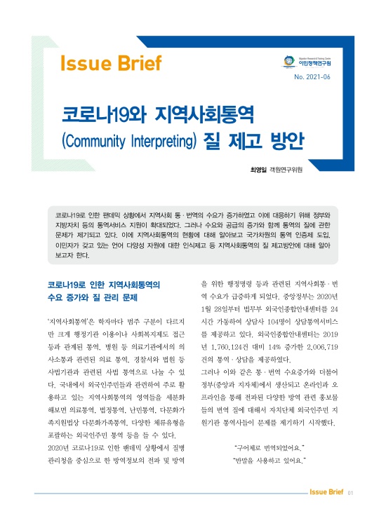 코로나19로 인한 팬데믹 상황에서 지역사회 통·번역의 수요가 증가하였고 이에 대응하기 위해 정부와 지방자치 등의 통역서비스 지원이 확대되었다. 그러나 수요와 공급의 증가와 함께 통역의 질에 관한 문제가 제기되고 있다. 이에 지역사회통역의 현황에 대해 알아보고 국가차원의 통역 인증제 도입, 이민자가 갖고 있는 언어 다양성 자원에 대한 인식제고 등 지역사회통역의 질 제고방안에 대해 알아보고자 한다.