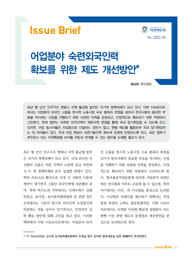 최근 몇 년간 인구구조 변화나 지역 불균형 발전은 국가적 정책의제가 되고 있다. 이번 이슈브리프에서는 어업분야 외국인 고용을 한시적 노동시장 수요 충족의 관점을 넘어서 한국사회의 중요한 부분을 차지하는 산업을 지탱하기 위한 숙련된 인력을 양성하고, 안정적으로 확보하기 위한 차원에서 고민한다. 현재 정부는 숙련된 외국인력이 체류자격 변경을 통해 국내 장기취업할 수 있도록 하고 있지만, 어업 종사자들은 타업종으로 이탈하는 경우가 많고, 현행 제도를 활용하여 국내 장기취업하는 데 어려움이 있다. 국내 어업 현실이 숙련기능인력 점수제 운영에 반영되도록 하고, 최근 정부가 추진하고 있는 지역특화형 비자를 어업과 연계할 수 있는 방안을 모색할 필요가 있다.