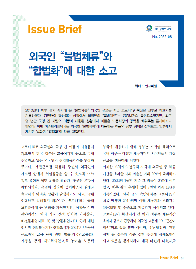 2010년대 이후 점차 증가해 온 “불법체류” 외국인 규모는 최근 코로나19 확산을 전후로 최고치를 기록하였다. 감염병이 확산되는 상황에서 외국인의 “불법체류”는 공중보건의 불안요소였지만, 최근 몇 년간 국경 간 사람의 이동이 제한된 상황에서 이들은 노동시장의 공백을 채워주는 존재이기도하였다. 이번 이슈브리프에서는 외국인 “불법체류”에 대응하는 최근의 정부 정책을 살펴보고, 일부에서 제기한 일회성 “합법화”에 대해 고찰한다.