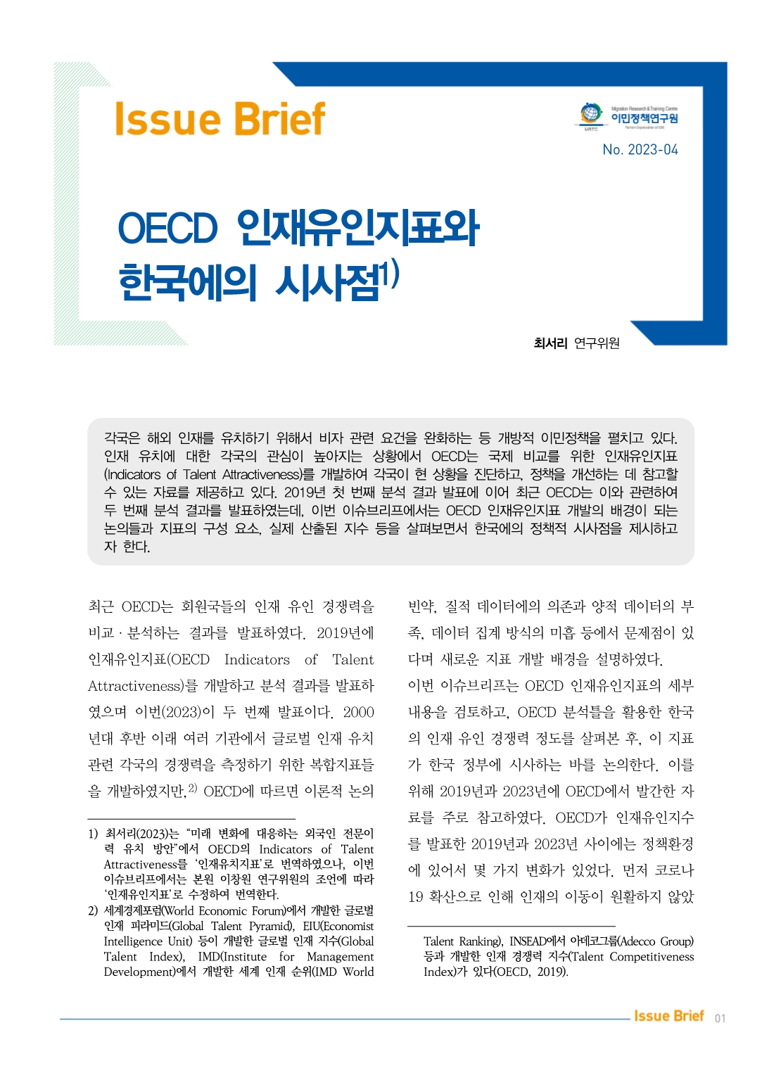 각국은 해외 인재를 유치하기 위해서 비자 관련 요건을 완화하는 등 개방적 이민정책을 펼치고 있다. 인재 유치에 대한 각국의 관심이 높아지는 상황에서 OECD는 국제 비교를 위한 인재유인지표(Indicators of Talent Attractiveness)를 개발하여 각국이 현 상황을 진단하고, 정책을 개선하는 데 참고할 수 있는 자료를 제공하고 있다. 2019년 첫 번째 분석 결과 발표에 이어 최근 OECD는 이와 관련하여 두 번째 분석 결과를 발표하였는데, 이번 이슈브리프에서는 OECD 인재유인지표 개발의 배경이 되는 논의들과 지표의 구성 요소, 실제 산출된 지수 등을 살펴보면서 한국에의 정책적 시사점을 제시하고자 한다.
