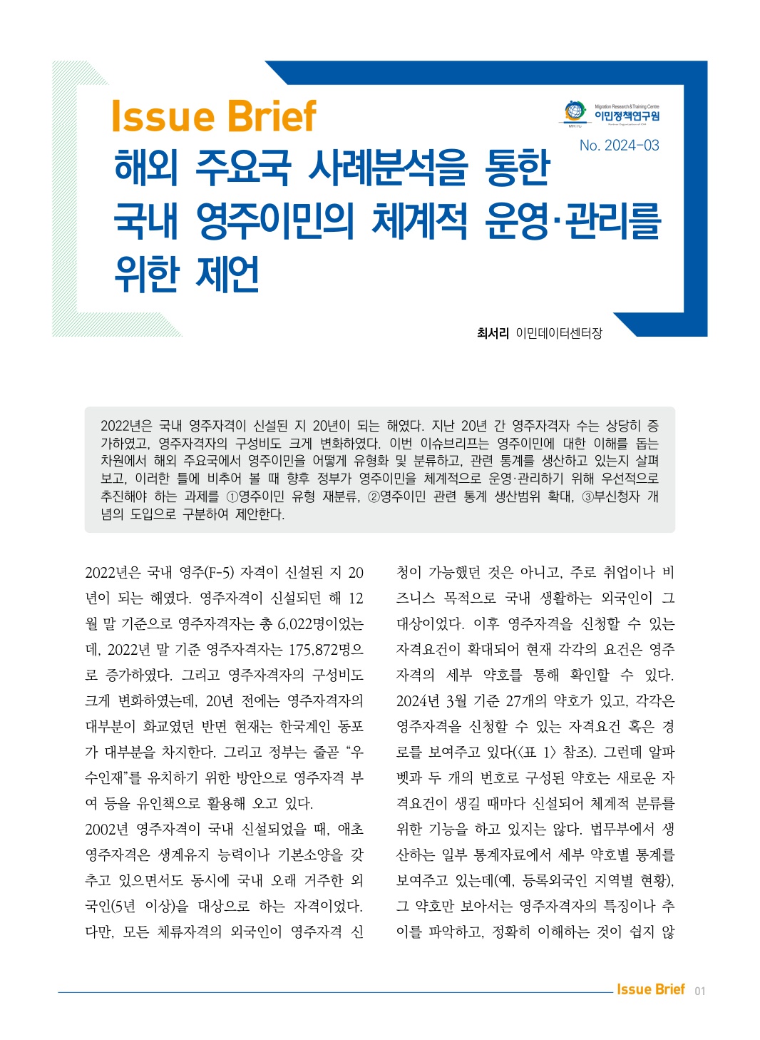 2022년은 국내 영주자격이 신설된 지 20년이 되는 해였다. 지난 20년 간 영주자격자 수는 상당히 증가하였고, 영주자격자의 구성비도 크게 변화하였다. 이번 이슈브리프는 영주이민에 대한 이해를 돕는 차원에서 해외 주요국에서 영주이민을 어떻게 유형화 및 분류하고, 관련 통계를 생산하고 있는지 살펴보고, 이러한 틀에 비추어 볼 때 향후 정부가 영주이민을 체계적으로 운영·관리하기 위해 우선적으로 추진해야 하는 과제를 ①영주이민 유형 재분류, ②영주이민 관련 통계 생산범위 확대, ③부신청자 개념의 도입으로 구분하여 제안한다.