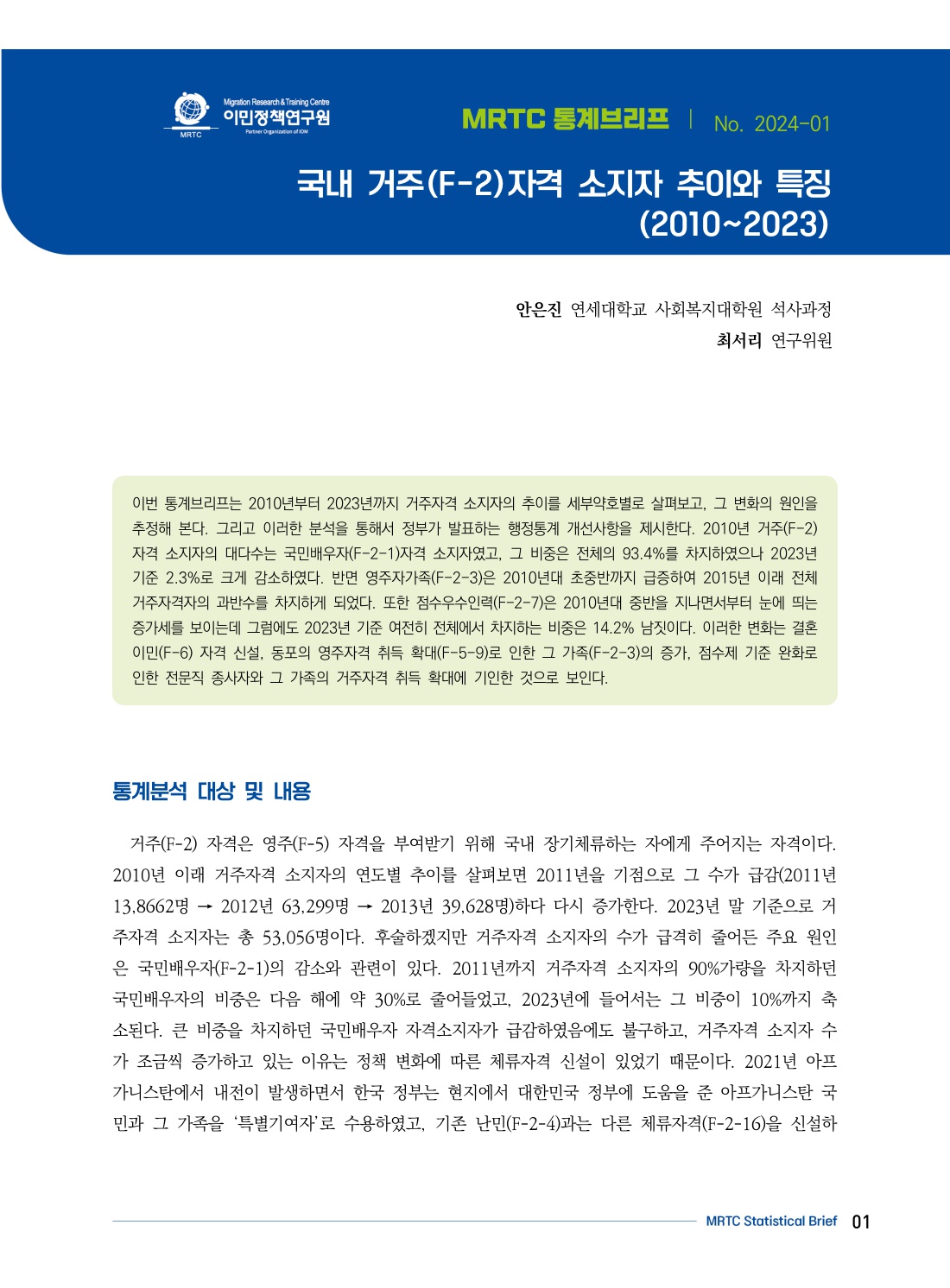 이번 통계브리프는 2010년부터 2023년까지 거주자격 소지자의 추이를 세부약호별로 살펴보고, 그 변화의 원인을 추정해 본다. 그리고 이러한 분석을 통해서 정부가 발표하는 행정통계 개선사항을 제시한다. 2010년 거주(F-2) 자격 소지자의 대다수는 국민배우자(F-2-1)자격 소지자였고, 그 비중은 전체의 93.4%를 차지하였으나 2023년 기준 2.3%로 크게 감소하였다. 반면 영주자가족(F-2-3)은 2010년대 초중반까지 급증하여 2015년 이래 전체 거주자격자의 과반수를 차지하게 되었다. 또한 점수우수인력(F-2-7)은 2010년대 중반을 지나면서부터 눈에 띄는 증가세를 보이는데 그럼에도 2023년 기준 여전히 전체에서 차지하는 비중은 14.2% 남짓이다. 이러한 변화는 결혼 이민(F-6) 자격 신설, 동포의 영주자격 취득 확대(F-5-9)로 인한 그 가족(F-2-3)의 증가, 점수제 기준 완화로 인한 전문직 종사자와 그 가족의 거주자격 취득 확대에 기인한 것으로 보인다.