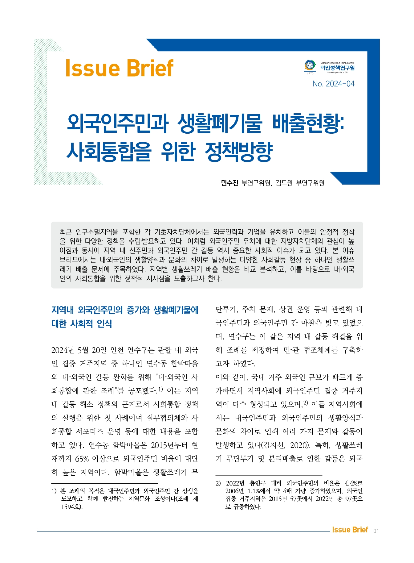 최근 인구소멸지역을 포함한 각 기초자치단체에서는 외국인력과 기업을 유치하고 이들의 안정적 정착 을 위한 다양한 정책을 수립‧발표하고 있다. 이처럼 외국인주민 유치에 대한 지방자치단체의 관심이 높아짐과 동시에 지역 내 선주민과 외국인주민 간 갈등 역시 중요한 사회적 이슈가 되고 있다. 본 이슈브리프에서는 내‧외국인의 생활양식과 문화의 차이로 발생하는 다양한 사회갈등 현상 중 하나인 생활쓰레기 배출 문제에 주목하였다. 지역별 생활쓰레기 배출 현황을 비교 분석하고, 이를 바탕으로 내외국인의 사회통합을 위한 정책적 시사점을 도출하고자 한다.