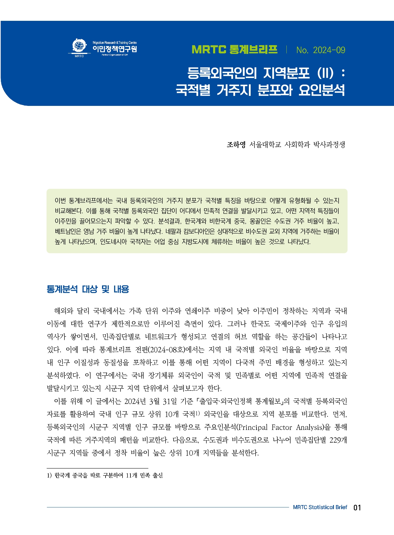 이번 통계브리프에서는 국내 등록외국인의 거주지 분포가 국적별 특징을 바탕으로 어떻게 유형화될 수 있는지 비교해본다. 이를 통해 국적별 등록외국인 집단이 어디에서 민족적 연결을 발달시키고 있고, 어떤 지역적 특징들이 이주민을 끌어모으는지 파악할 수 있다. 분석결과, 한국계와 비한국계 중국, 몽골인은 수도권 거주 비율이 높고, 베트남인은 영남 거주 비율이 높게 나타났다. 네팔과 캄보디아인은 상대적으로 비수도권 교외 지역에 거주하는 비율이 높게 나타났으며, 인도네시아 국적자는 어업 중심 지방도시에 체류하는 비율이 높은 것으로 나타났다.