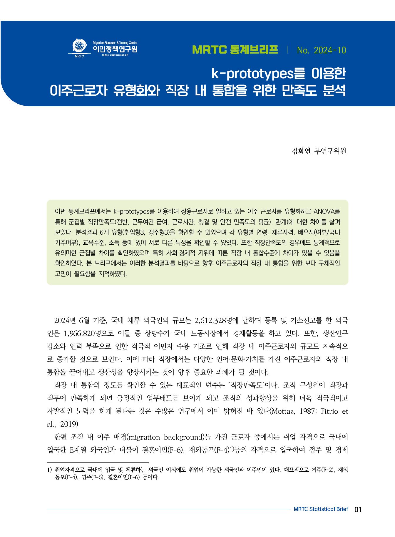 이번 통계브리프에서는 k-prototypes를 이용하여 상용근로자로 일하고 있는 이주 근로자를 유형화하고 ANOVA를 통해 군집별 직장만족도(전반, 근무여건 급여, 근로시간, 청결 및 안전 만족도의 평균), 관계)에 대한 차이를 살펴보았다. 분석결과 6개 유형(취업형3, 정주형3)을 확인할 수 있었으며 각 유형별 연령, 체류자격, 배우자(여부/국내 거주여부), 교육수준, 소득 등에 있어 서로 다른 특성을 확인할 수 있었다. 또한 직장만족도의 경우에도 통계적으로 유의미한 군집별 차이를 확인하였으며 특히 사회·경제적 지위에 따른 직장 내 통합수준에 차이가 있을 수 있음을 확인하였다. 본 브리프에서는 이러한 분석결과를 바탕으로 향후 이주근로자의 직장 내 통합을 위한 보다 구체적인 고민이 필요함을 지적하였다.