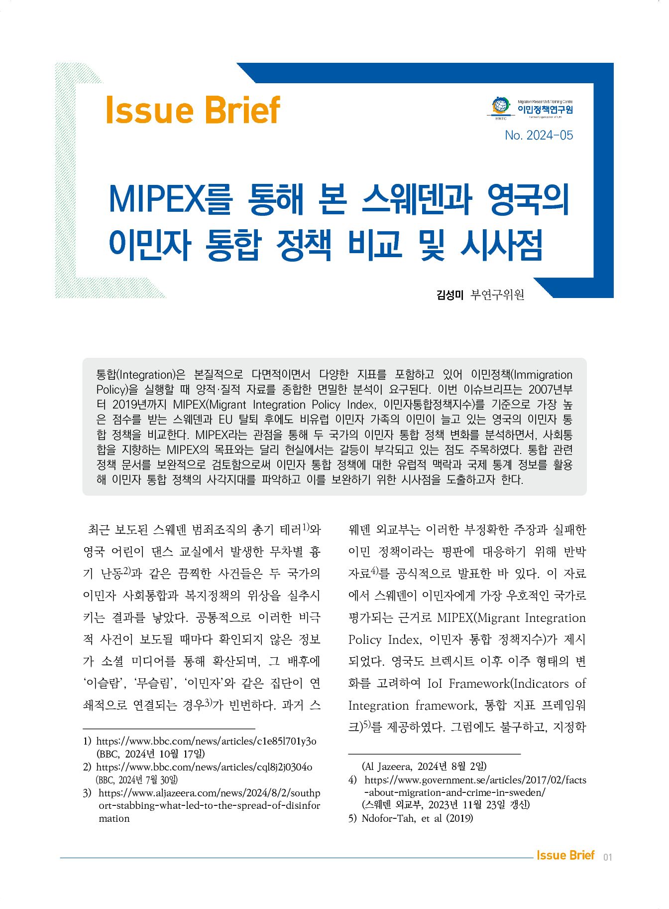 통합(Integration)은 본질적으로 다면적이면서 다양한 지표를 포함하고 있어 이민정책(Immigration Policy)을 실행할 때 양적·질적 자료를 종합한 면밀한 분석이 요구된다. 이번 이슈브리프는 2007년부터 2019년까지 MIPEX(Migrant Integration Policy Index, 이민자통합정책지수)를 기준으로 가장 높은 점수를 받는 스웨덴과 EU 탈퇴 후에도 비유럽 이민자 가족의 이민이 늘고 있는 영국의 이민자 통합 정책을 비교한다. MIPEX라는 관점을 통해 두 국가의 이민자 통합 정책 변화를 분석하면서, 사회통합을 지향하는 MIPEX의 목표와는 달리 현실에서는 갈등이 부각되고 있는 점도 주목하였다. 통합 관련 정책 문서를 보완적으로 검토함으로써 이민자 통합 정책에 대한 유럽적 맥락과 국제 통계 정보를 활용해 이민자 통합 정책의 사각지대를 파악하고 이를 보완하기 위한 시사점을 도출하고자 한다.