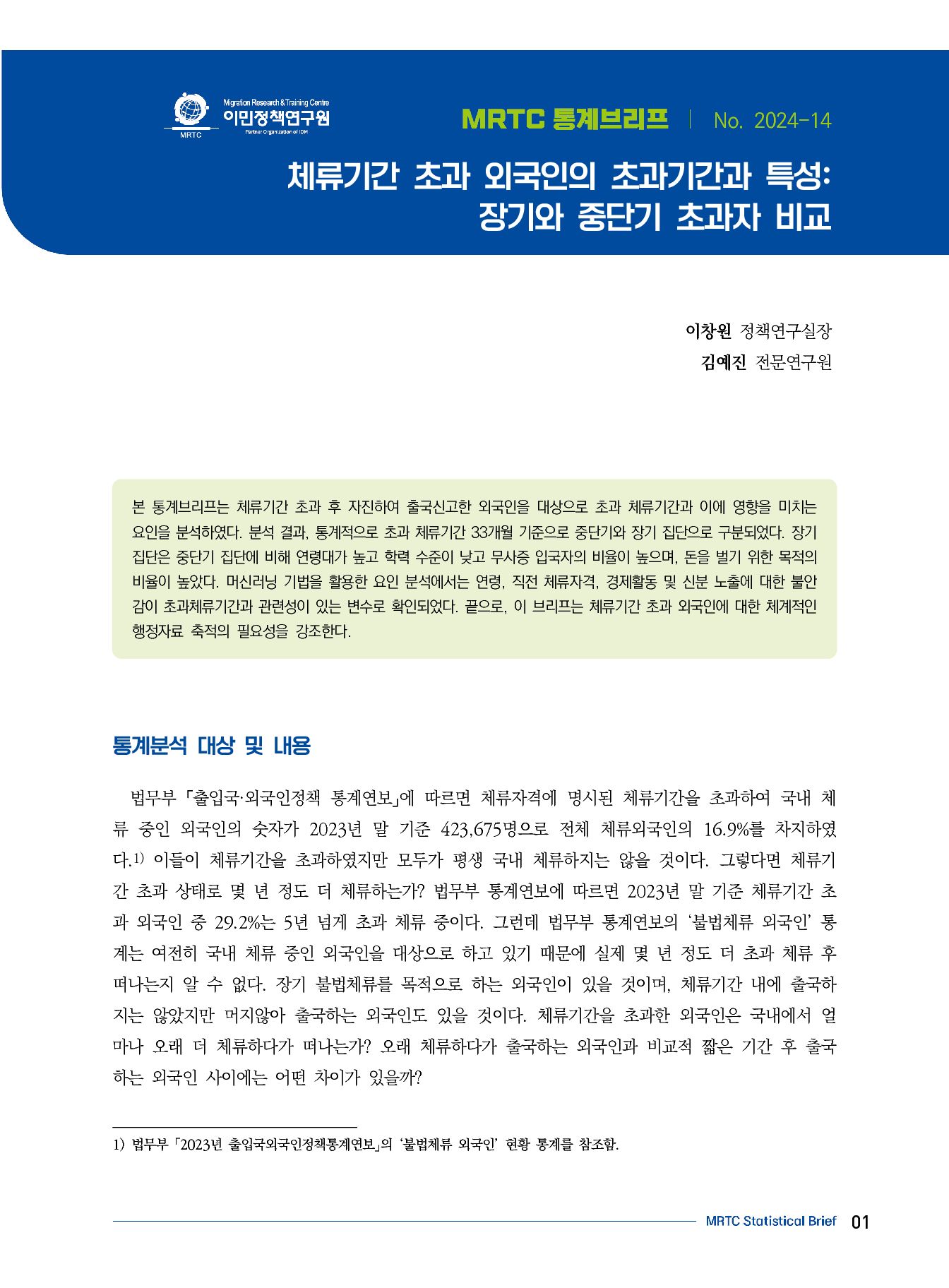 본 통계브리프는 체류기간 초과 후 자진하여 출국신고한 외국인을 대상으로 초과 체류기간과 이에 영향을 미치는 요인을 분석하였다. 분석 결과, 통계적으로 초과 체류기간 33개월 기준으로 중단기와 장기 집단으로 구분되었다. 장기집단은 중단기 집단에 비해 연령대가 높고 학력 수준이 낮고 무사증 입국자의 비율이 높으며, 돈을 벌기 위한 목적의 비율이 높았다. 머신러닝 기법을 활용한 요인 분석에서는 연령, 직전 체류자격, 경제활동 및 신분 노출에 대한 불안감이 초과체류기간과 관련성이 있는 변수로 확인되었다. 끝으로, 이 브리프는 체류기간 초과 외국인에 대한 체계적인 행정자료 축적의 필요성을 강조한다.