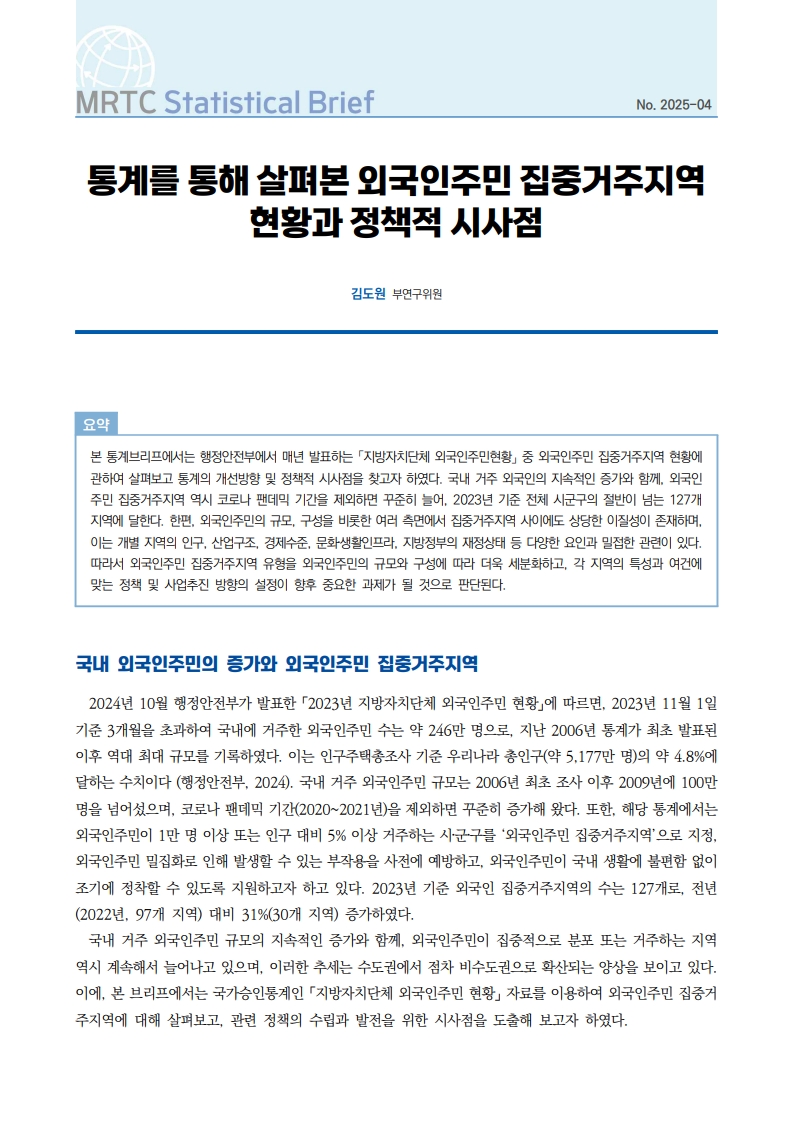 본 통계브리프에서는 행정안전부에서 매년 발표하는 「지방자치단체 외국인주민현황」 중 외국인주민 집중거주지역 현황에 관하여 살펴보고 통계의 개선방향 및 정책적 시사점을 찾고자 하였다. 국내 거주 외국인의 지속적인 증가와 함께, 외국인 주민 집중거주지역 역시 코로나 팬데믹 기간을 제외하면 꾸준히 늘어, 2023년 기준 전체 시군구의 절반이 넘는 127개 지역에 달한다. 한편, 외국인주민의 규모, 구성을 비롯한 여러 측면에서 집중거주지역 사이에도 상당한 이질성이 존재하며, 이는 개별 지역의 인구, 산업구조, 경제수준, 문화‧생활인프라, 지방정부의 재정상태 등 다양한 요인과 밀접한 관련이 있다. 따라서 외국인주민 집중거주지역 유형을 외국인주민의 규모와 구성에 따라 더욱 세분화하고, 각 지역의 특성과 여건에 맞는 정책 및 사업추진 방향의 설정이 향후 중요한 과제가 될 것으로 판단된다.