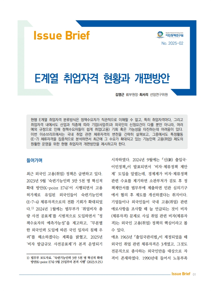 현행 E계열 취업자격 분류방식은 정책수요자가 직관적으로 이해할 수 없고, 특히 취업자격마다, 그리고 취업자격 내에서도 산업과 직종에 따라 기업(사업주)과 외국인의 신청요건이 다를 뿐만 아니라, 여러 예외 규정으로 인해 정책수요자들이 쉽게 취업(고용) 기회 혹은 가능성을 타진하는데 어려움이 있다. 이번 이슈브리프에서는 국내 취업 관련 체류자격의 변천을 간략히 살펴보고, 그중에서도 특정활동 (E-7) 체류자격을 집중적으로 분석하면서 최근에 그 수요가 확대되고 있는 기능인력 고용(취업) 제도의 원활한 운영을 위한 현행 취업자격 개편방안을 제시하고자 한다.