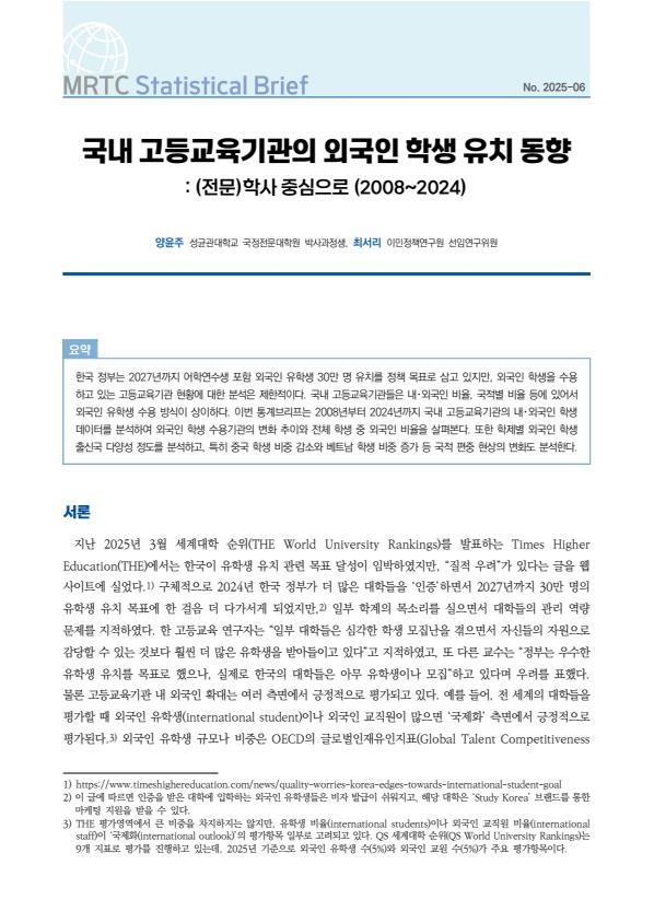 한국 정부는 2027년까지 어학연수생 포함 외국인 유학생 30만 명 유치를 정책 목표로 삼고 있지만, 외국인 학생을 수용하고 있는 고등교육기관 현황에 대한 분석은 제한적이다. 국내 고등교육기관들은 내・외국인 비율, 국적별 비율 등에 있어서 외국인 유학생 수용 방식이 상이하다. 이번 통계브리프는 2008년부터 2024년까지 국내 고등교육기관의 내・외국인 학생 데이터를 분석하여 외국인 학생 수용기관의 변화 추이와 전체 학생 중 외국인 비율을 살펴본다. 또한 학제별 외국인 학생 출신국 다양성 정도를 분석하고, 특히 중국 학생 비중 감소와 베트남 학생 비중 증가 등 국적 편중 현상의 변화도 분석한다.