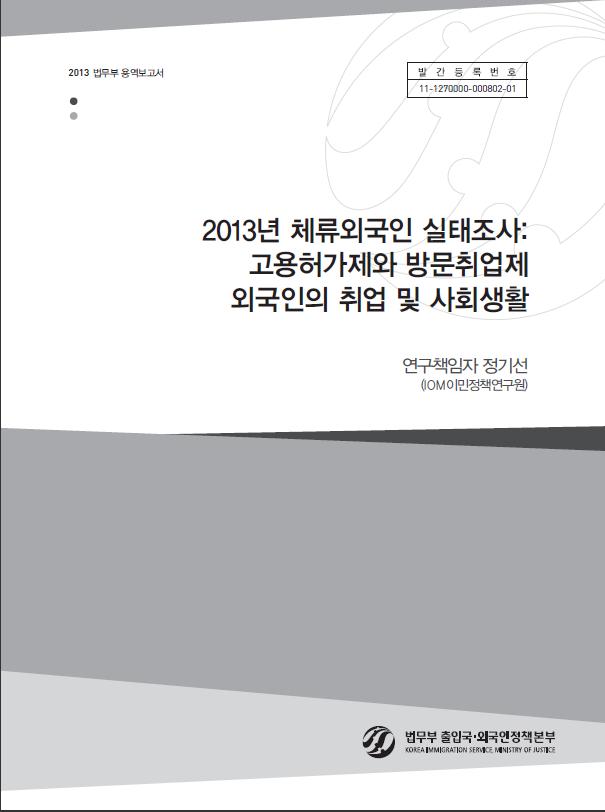 국내에 체류하는 외국인 등에 대한 체류실태 조사 및 분석을 통하여 향후 이민정책의 과학적 업무 수행 지원 및 중장기 이민정책 수립에 필요한 기초자료를 확보하고자 국내에 체류하는 비전문취업, 방문취업, 전문인력에 대한 국내 취업 현황 및 사회생활 실태, 행정서비스 만족도 등의 실태조사를 진행함.