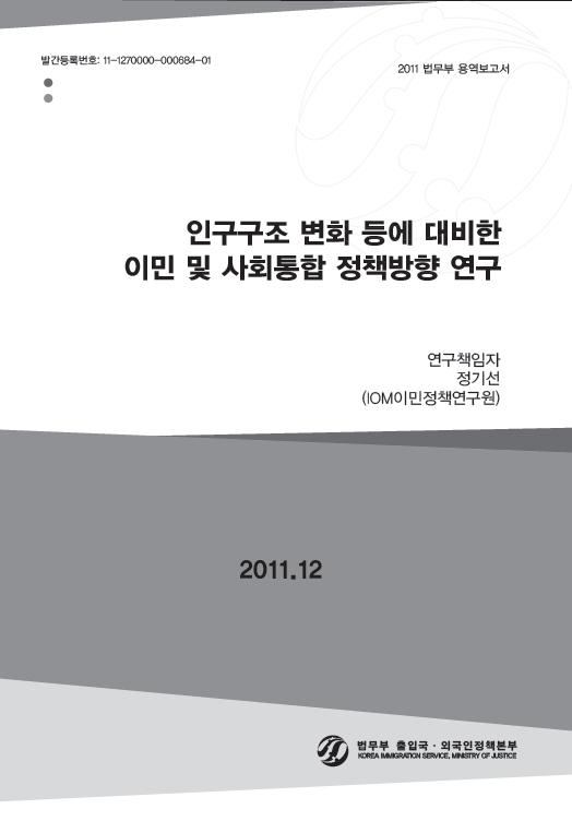 요약: 2011년 장래인구추계를 근거로 총인구 감소저지, 생산연령인구 감소저지, 인구고령화 진전을 저지하는 데 필요한 적정 인구유입 규모를 추정하고 주소비층 인구감소 저지를 위한 외국인 수를 추정하여 인구변화에 대한 적절한 대응, 지속성장을 위한 새로운 동력, 세계화에 따른 지역공동발전 등 우리나라의 국제적인 위상 및 경제규모에 걸맞는 이민·사회 통합정책방향을 제시하고자 함.
