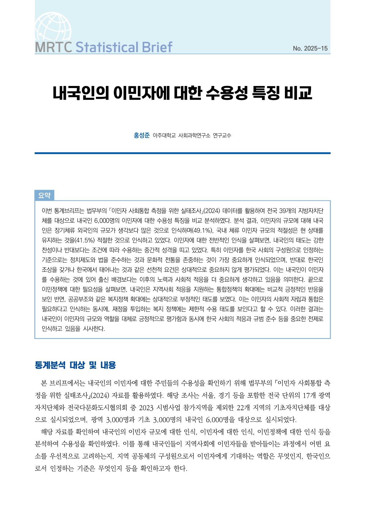 이번 통계브리프는 법무부의 「이민자 사회통합 측정을 위한 실태조사」(2024) 데이터를 활용하여 전국 39개의 지방자치단체를 대상으로 내국인 6,000명의 이민자에 대한 수용성 특징을 비교 분석하였다. 분석 결과, 이민자의 규모에 대해 내국인은 장기체류 외국인의 규모가 생각보다 많은 것으로 인식하며(49.1%), 국내 체류 이민자 규모의 적절성은 현 상태를 유지하는 것을(41.5%) 적절한 것으로 인식하고 있었다. 이민자에 대한 전반적인 인식을 살펴보면, 내국인의 태도는 강한 찬성이나 반대보다는 조건에 따라 수용하는 중간적 성격을 띠고 있었다. 특히 이민자를 한국 사회의 구성원으로 인정하는 기준으로는 정치제도와 법을 준수하는 것과 문화적 전통을 존중하는 것이 가장 중요하게 인식되었으며, 반대로 한국인 조상을 갖거나 한국에서 태어나는 것과 같은 선천적 요건은 상대적으로 중요하지 않게 평가되었다. 이는 내국인이 이민자를 수용하는 것에 있어 출신 배경보다는 이후의 노력과 사회적 적응을 더 중요하게 생각하고 있음을 의미한다. 끝으로 이민정책에 대한 필요성을 살펴보면, 내국인은 지역사회 적응을 지원하는 통합정책의 확대에는 비교적 긍정적인 반응을 보인 반면, 공공부조와 같은 복지정책 확대에는 상대적으로 부정적인 태도를 보였다. 이는 이민자의 사회적 자립과 통합은 필요하다고 인식하는 동시에, 재정을 투입하는 복지 정책에는 제한적 수용 태도를 보인다고 할 수 있다. 이러한 결과는 내국인이 이민자의 규모와 역할을 대체로 긍정적으로 평가함과 동시에 한국 사회의 적응과 규범 준수 등을 중요한 전제로 인식하고 있음을 시사한다.