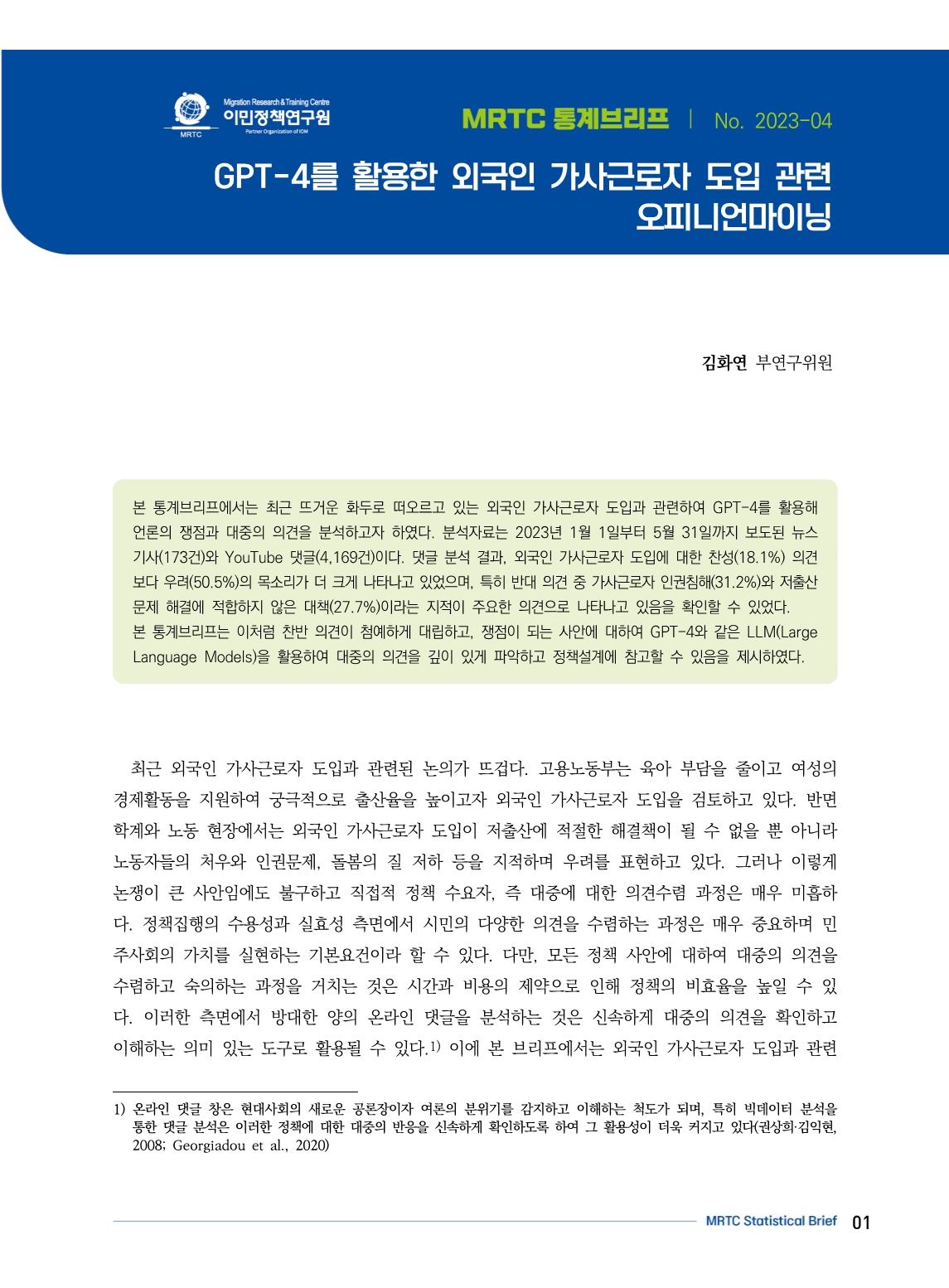 본 통계브리프에서는 최근 뜨거운 화두로 떠오르고 있는 외국인 가사근로자 도입과 관련하여 GPT-4를 활용해 언론의 쟁점과 대중의 의견을 분석하고자 하였다. 분석자료는 2023년 1월 1일부터 5월 31일까지 보도된 뉴스 기사(173건)와 YouTube 댓글(4,169건)이다. 댓글 분석 결과, 외국인 가사근로자 도입에 대한 찬성(18.1%) 의견 보다 우려(50.5%)의 목소리가 더 크게 나타나고 있었으며, 특히 반대 의견 중 가사근로자 인권침해(31.2%)와 저출산 문제 해결에 적합하지 않은 대책(27.7%)이라는 지적이 주요한 의견으로 나타나고 있음을 확인할 수 있었다. 본 통계브리프는 이처럼 찬반 의견이 첨예하게 대립하고, 쟁점이 되는 사안에 대하여 GPT-4와 같은 LLM(Large Language Models)을 활용하여 대중의 의견을 깊이 있게 파악하고 정책설계에 참고할 수 있음을 제시하였다.