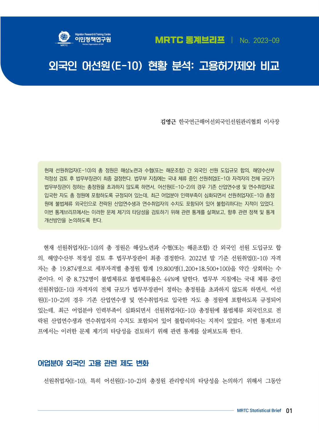 현재 선원취업자(E-10)의 총 정원은 해상노련과 수협(또는 해운조합) 간 외국인 선원 도입규모 합의, 해양수산부 적정성 검토 후 법무부장관이 최종 결정한다. 법무부 지침에는 국내 체류 중인 선원취업(E-10) 자격자의 전체 규모가 법무부장관이 정하는 총정원을 초과하지 않도록 하면서, 어선원(E-10-2)의 경우 기존 산업연수생 및 연수취업자로 입국한 자도 총 정원에 포함하도록 규정되어 있는데, 최근 어업분야 인력부족이 심화되면서 선원취업자(E-10) 총정원에 불법체류 외국인으로 전락된 산업연수생과 연수취업자의 수치도 포함되어 있어 불합리하다는 지적이 있었다. 이번 통계브리프에서는 이러한 문제 제기의 타당성을 검토하기 위해 관련 통계를 살펴보고, 향후 관련 정책 및 통계 개선방안을 논의하도록 한다.