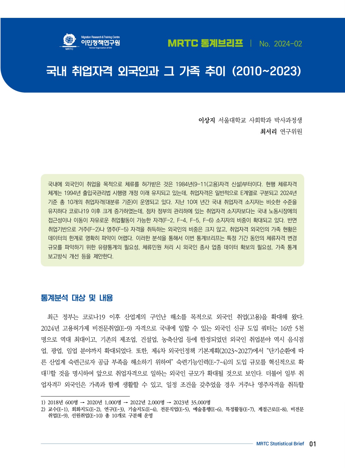 국내에 외국인이 취업을 목적으로 체류를 허가받은 것은 1984년(9-11(고용)자격 신설)부터이다. 현행 체류자격 체계는 1994년 출입국관리법 시행령 개정 이래 유지되고 있는데, 취업자격은 일반적으로 E계열로 구분되고 2024년 기준 총 10개의 취업자격(대분류 기준)이 운영되고 있다. 지난 10여 년간 국내 취업자격 소지자는 비슷한 수준을 유지하다 코로나19 이후 크게 증가하였는데, 점차 정부의 관리하에 있는 취업자격 소지자보다는 국내 노동시장에의 접근성이나 이동이 자유로운 취업활동이 가능한 자격(F-2, F-4, F-5, F-6) 소지자의 비중이 확대되고 있다. 반면 취업기반으로 거주(F-2)나 영주(F-5) 자격을 취득하는 외국인의 비중은 크지 않고, 취업자격 외국인의 가족 현황은 데이터의 한계로 명확히 파악이 어렵다. 이러한 분석을 통해서 이번 통계브리프는 특정 기간 동안의 체류자격 변경 규모를 파악하기 위한 유량통계의 필요성, 체류민원 처리 시 외국인 종사 업종 데이터 확보의 필요성, 가족 통계 보고방식 개선 등을 제안한다.
