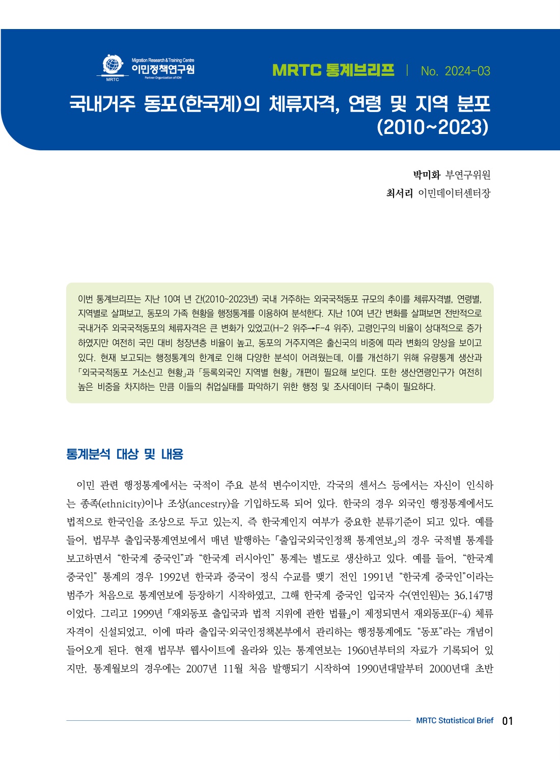 이번 통계브리프는 지난 10여 년 간(2010~2023년) 국내 거주하는 외국국적동포 규모의 추이를 체류자격별, 연령별, 지역별로 살펴보고, 동포의 가족 현황을 행정통계를 이용하여 분석한다. 지난 10여 년간 변화를 살펴보면 전반적으로 국내거주 외국국적동포의 체류자격은 큰 변화가 있었고(H-2 위주→F-4 위주), 고령인구의 비율이 상대적으로 증가 하였지만 여전히 국민 대비 청장년층 비율이 높고, 동포의 거주지역은 출신국의 비중에 따라 변화의 양상을 보이고 있다. 현재 보고되는 행정통계의 한계로 인해 다양한 분석이 어려웠는데, 이를 개선하기 위해 유량통계 생산과 「외국국적동포 거소신고 현황」과 「등록외국인 지역별 현황」 개편이 필요해 보인다. 또한 생산연령인구가 여전히 높은 비중을 차지하는 만큼 이들의 취업실태를 파악하기 위한 행정 및 조사데이터 구축이 필요하다.