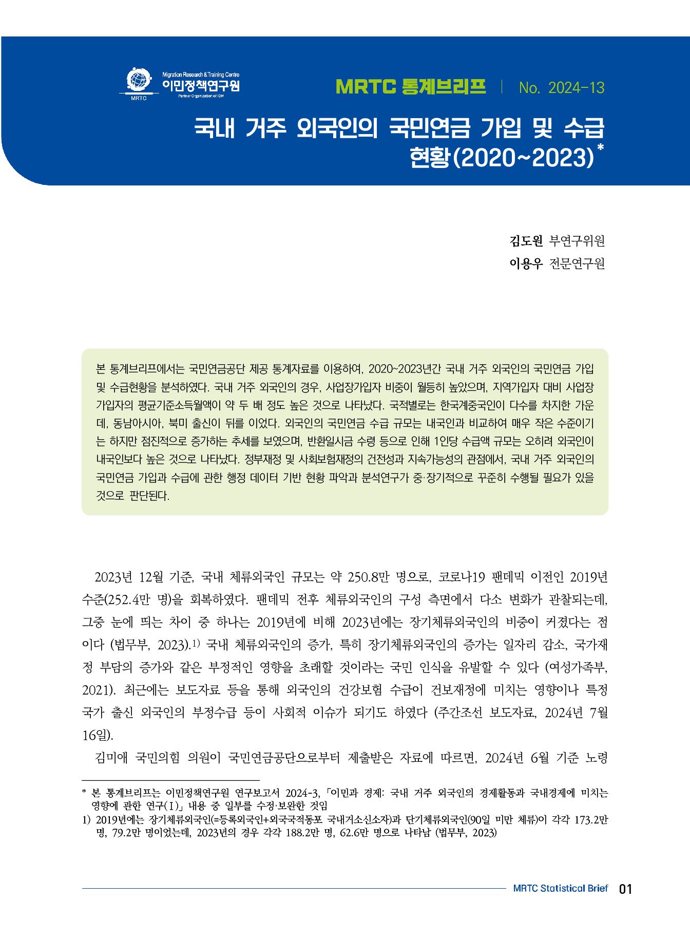 본 통계브리프에서는 국민연금공단 제공 통계자료를 이용하여, 2020~2023년간 국내 거주 외국인의 국민연금 가입 및 수급현황을 분석하였다. 국내 거주 외국인의 경우, 사업장가입자 비중이 월등히 높았으며, 지역가입자 대비 사업장 가입자의 평균기준소득월액이 약 두 배 정도 높은 것으로 나타났다. 국적별로는 한국계중국인이 다수를 차지한 가운데, 동남아시아, 북미 출신이 뒤를 이었다. 외국인의 국민연금 수급 규모는 내국인과 비교하여 매우 작은 수준이기는 하지만 점진적으로 증가하는 추세를 보였으며, 반환일시금 수령 등으로 인해 1인당 수급액 규모는 오히려 외국인이 내국인보다 높은 것으로 나타났다. 정부재정 및 사회보험재정의 건전성과 지속가능성의 관점에서, 국내 거주 외국인의 국민연금 가입과 수급에 관한 행정 데이터 기반 현황 파악과 분석연구가 중·장기적으로 꾸준히 수행될 필요가 있을 것으로 판단된다.